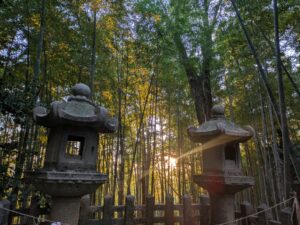 山の上にある本殿へはケーブルカーでも行けますが、おすすめは片道20分ほどの徒歩ルートです。少し急な階段もありますが、写真のような美しい竹林や木々に囲まれた参道を歩くとリフレッシュすることができます。